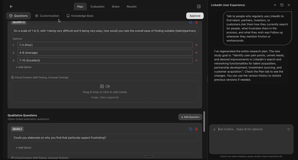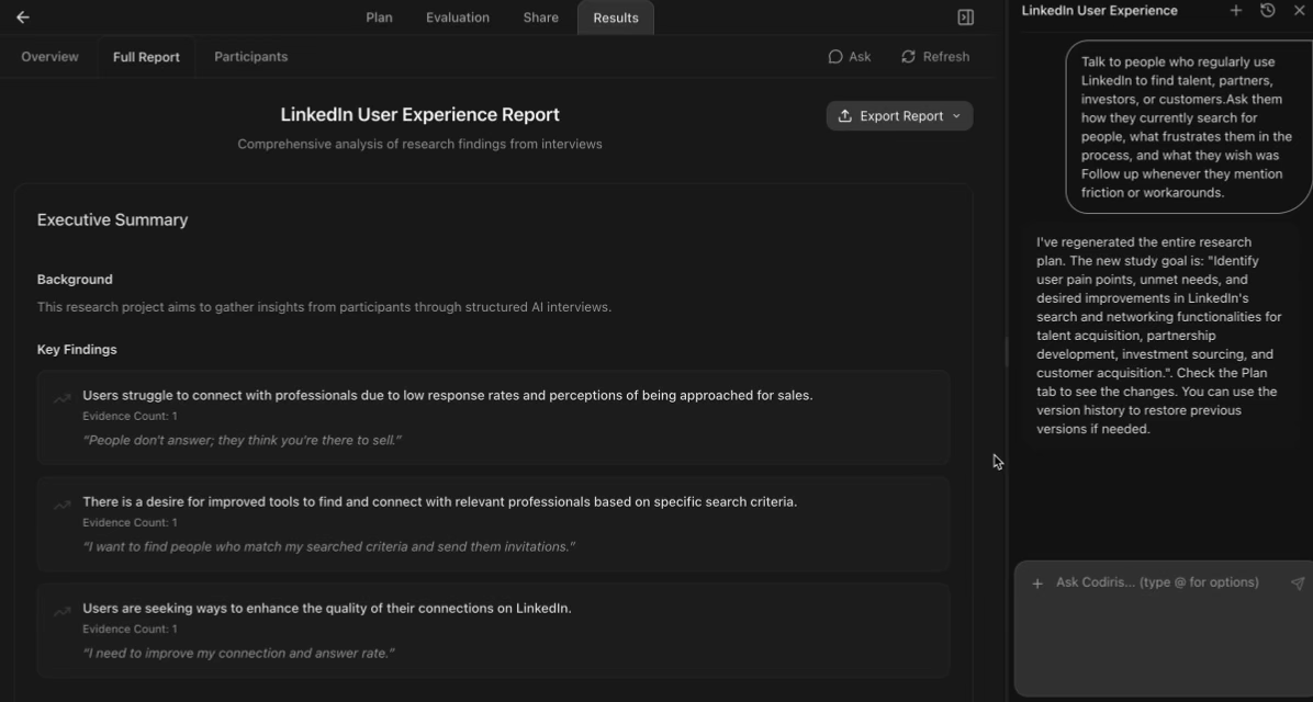 We believe that user research shouldn’t be a bottleneck; it should be a continuous stream of truth. Codiris isn’t a survey tool. It is an AI-native environment that connects user insights with your roadmap. conducts voice-to-voice interviews with your users at scale.